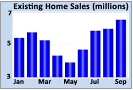 The spectacular rebound in the housing sector from weakness during the spring due to the partial shutdown of the economy has continued. In September, Existing Home Sales increased 9% from August and were 21% higher than a year ago, at the best level since May 2006. The median existing-home price was 15% higher than a year ago.