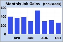 Against a consensus forecast of 205,000, the economy gained 261,000 jobs in October, the smallest monthly increase since December 2020. The best performing sectors were leisure, hospitality, professional services, and health care. The unemployment rate rose more than expected to 3.7% from 3.5%, which was the lowest level in decades. Average hourly earnings, an indicator of wage growth, were 4.7% higher than a year ago, down from an annual rate of 5.0% last month.