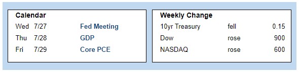 Looking ahead, the next Fed meeting will take place on Wednesday. Investors anticipate a 75 basis point rate hike and will look for additional guidance on the pace of future rate hikes and bond portfolio reduction. Beyond that, New Home Sales and Consumer Confidence will be released on Tuesday. Second quarter GDP, the broadest measure of economic activity, will come out on Thursday. The core PCE price index, the inflation indicator favored by the Fed, will be released on Friday.