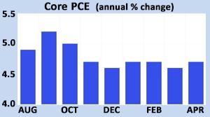 The PCE price index is the inflation indicator favored by the Fed. In April, core PCE, which excludes food and energy to reduce volatility, was up 4.7% from a year ago, a little above the consensus forecast, and up from an annual rate of 4.6% last month. The cost of services continued to increase more than prices for goods.