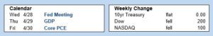 Looking ahead, investors will continue watching COVID case counts and vaccine distribution. Beyond that, the next Fed meeting will take place on Wednesday. No change in the federal funds rate is expected, and investors will be looking for guidance on the pace of future bond purchases. First quarter GDP, the broadest measure of economic activity, will be released on Thursday. The core PCE price index, the inflation indicator favored by the Fed, will come out on Friday.