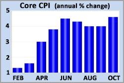 The Consumer Price Index (CPI) is a closely watched inflation indicator that looks at price changes for a broad range of goods and services. Core CPI excludes the volatile food and energy components and provides a clearer picture of the longer-term trend. In October, Core CPI was 4.6% higher than a year ago, up from an annual rate of increase of 4.0% last month, and the highest level since 1991.