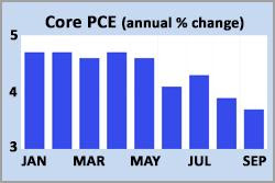 The PCE price index is the inflation indicator favored by the Fed. In September, core PCE, which excludes food and energy to reduce short-term volatility, was up 3.7% from a year ago, matching the consensus forecast. This was down from an annual rate of 3.9% last month and the lowest level since June 2021. While still moving in the right direction, it remains far above the Fed’s target level of 2.0%.