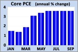 The core PCE price index is the inflation indicator favored by the Fed. In September, core PCE was 3.6% higher than a year ago, matching the consensus forecast. This was the same annual rate of increase as last month, but up from levels below 2.0% during the first three months of the year, and the highest annual rate since 1991. Economists have differing views on whether higher inflation will be short-lived or persist for years.