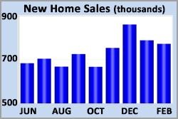 Sales of new homes declined for the second straight month in February, dropping 2% from January to an annualized rate of 772,000, below the consensus forecast of 810,000. The median new-home price was 11% higher than last year at this time at $400,600. Inventory levels unexpectedly rose to 407,000 units, the highest level since 2008, but over 90% of those homes were either under construction or not yet started.