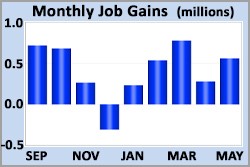 In May, the economy gained 559,000 jobs, a little below the consensus forecast of 650,000. Particular strength was seen in the leisure and hospitality sectors. The unemployment rate fell to 5.8%, slightly below the consensus of 5.9%. Average hourly earnings, an indicator of wage growth, were 2.0% higher than a year ago, up from an annual rate of increase of 0.4% last month.